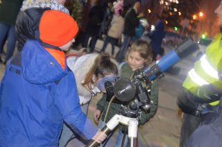 В 21.00 начала работать тротуарная астрономия. Пять телескопов установили на улице. К каждому прибору сразу же выстроилась очередь около 50-ти человек.