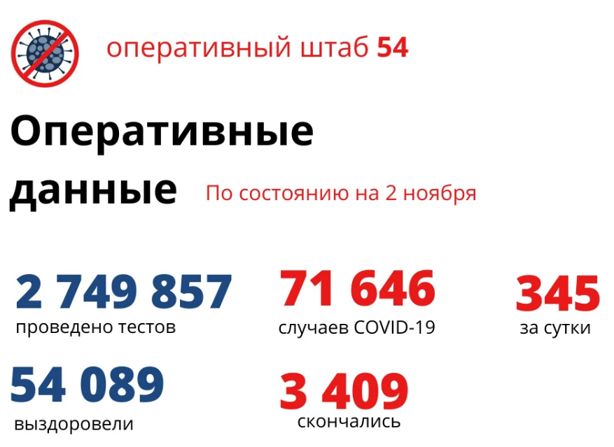 Как сообщают в оперштабе, ситуация в регионе по-прежнему остается довольно напряженной. За сутки выявлено 345 новых случаев заражения коронавирусом. С начала пандемии заболели 71 646 человек. После курса лечения по выздоровлению выписаны 159 новосибирцев за сутки (отметим, что вчера было всего 49 выздоровевших), а с начала пандемии – 54 089 человек.
