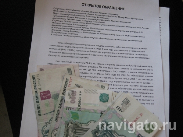 - "Совместно с управляющей компанией ЗАО «РНЗА» мы постоянно работаем над улучшением условий торговли, планомерно занимаемся реконструкцией рыночной территории, облагораживая ее и приводя в соответствие со стандартами цивилизованной торговли, – пишут Людмила Курикша и Марина Корниенко. – Еще задолго до 271-ФЗ мы хотели построить капитальный рыночный комплекс. Управление имущества и земельных ресурсов СО РАН дало согласие на реализацию этого проекта. Но в апреле 2005-го Сибирское отделение без объяснения причин отказалось от своих обязательств, строительство остановилось…»