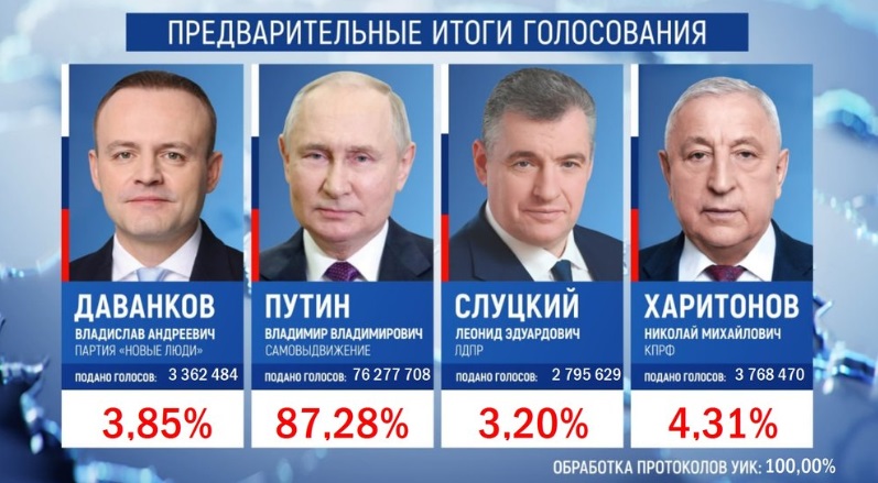 Лидером стал действующий президент России Владимир Путин: за него проголосовали 76 277 708 россиян (87,28% голосов). На выборах он был самовыдвиженцем. На втором месте Николай Харитонов от КПРФ: 3 768 470 голосов (4,31%), на третьем месте – Владислав Даванков от партии «Новые люди» – 3 362 484 голоса (3,85%). Замкнул список выдвиженец от ЛДПР Леонид Слуцкий – 2 795 629 голосов (3,20%).