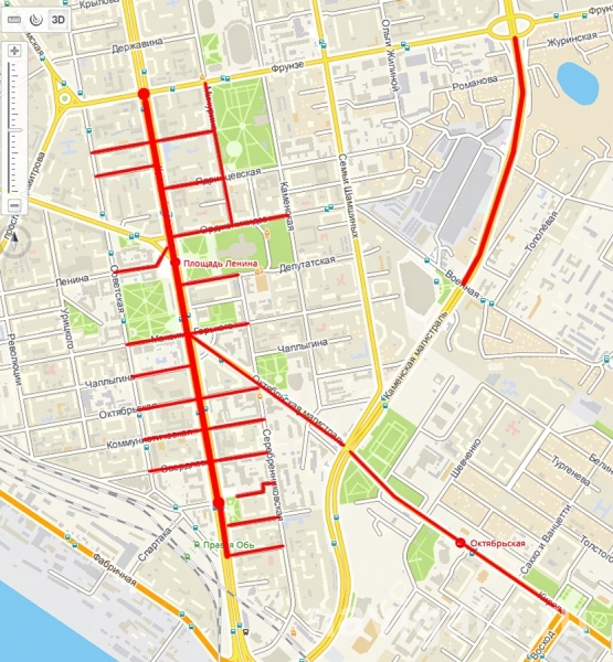 С 7 до 23 часов закроют Октябрьскую магистраль от ул. Каменской до Красного проспекта; ул. Кирова от Восхода до Каменской; Депутатскую от Красного проспекта до Серебренниковской, ул. Романова от Советской до Мичурина, ул. Октябрьскую от Советской до Серебренниковской, ул. Потанинскую от Советской до Красного проспекта, ул. Ленина от Советской до Красного проспекта, ул. Максима Горького от Советской до Серебренниковской, ул. Чаплыгина от Советской до Красного проспекта, ул. Коммунистическую от Советской до Серебренниковской, ул. Свердлова от Советской до Серебренниковской, ул. Сибревкома от Серебренниковской до Красного проспекта, ул. Спартака от Серебренниковской до Красного проспекта и ул. Каинскую от Серебренниковской до Красного проспекта.