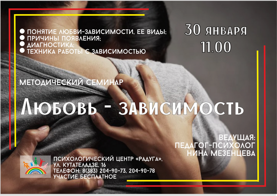 Любовь и уважение – одни из базовых потребностей человека. Что такое любовь? У каждого свое понимание этого чувства и его проявлений. Для кого-то это страдание, жертвенность, и многие именно такую всепоглощающую любовь называют настоящей. На самом деле это возможные проявления любви-зависимости. Как отличить её от здоровых отношений, расскажут в психологическом центре «Радуга». 30 января в 11.00 пройдет методический семинар «Любовь-зависимость». Приглашаются психологи, социальные педагоги и все, кому интересна эта тема. Участие бесплатное.