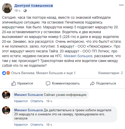 Чуть позже под его постом появился комментарий Михаила Большова, представителя компаний-перевозчиков ООО «Демос-С» и ООО ПП «ЛОТиОС». Его же машины обслуживают маршрут №20.