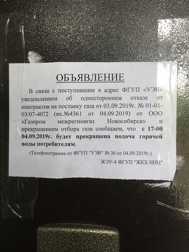 В паблике «Сообщество Академгородка» ближе к вечеру 4 сентября появилась информация: в подьездах домов в Нижней Ельцовке расклеили объявления об отключении горячей воды. Объявление гласило: «В связи с поступившим в адрес ФГУП «УЭВ» уведомлением об одностороннем отказе от контрактов на поставку газа от03.09.2019* № 01-01-03/07-4072» от ООО «Газпром межрегионгаз Новосибирск » и прекращением отбора газа сообщаем, что с 17.00 04.09.2019 будет прекращена подача горячей воды потребителям (телефонограмма от ФГУП «УЭВ» №36 от 04.09.2019). Подпись – ЖЭУ-4 ФГУП «ЖКХ ННЦ».