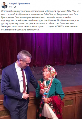 Сегодня был на церемонии награждения «Народной премии НГС». Там ко мне с просьбой обратилась знаменитая баба Зоя из Академгородка. Зоя Григорьевна Попова – творческий человек, она поёт, вяжет и любит садоводство. У неё даже свой огород есть в Ключах. Проблема в том, что дорогу к участку давно не ремонтировали и сейчас там большие ямы. Женщина попросила меня помочь прямо со сцены НОВАТа. Невозможно отказать! Минтранс уже занимается, – написал губернатор.