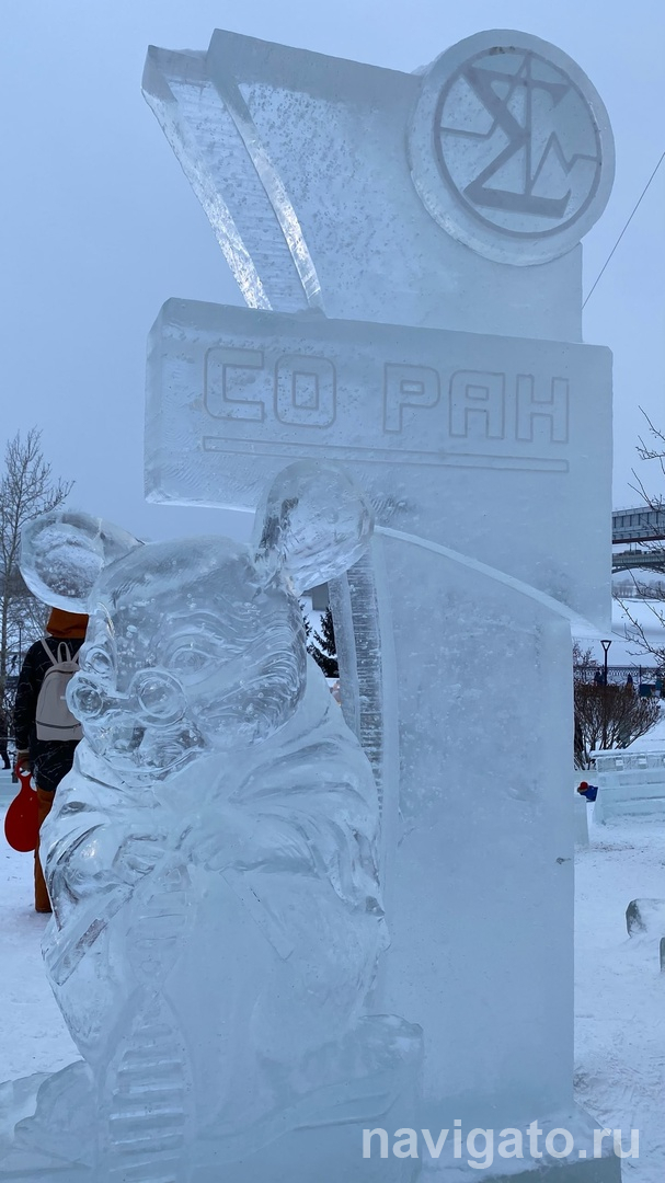 В этом году ледяных фигур не так много – около 20. Здесь есть и оперный театр, и академгородковская мышь, вяжущая ДНК, и Бугринский мост, и даже символ прошлых лет – Городовичок. Он в ракете, символизирует Анну Кикину – новосибирскую девушку-космонавта.