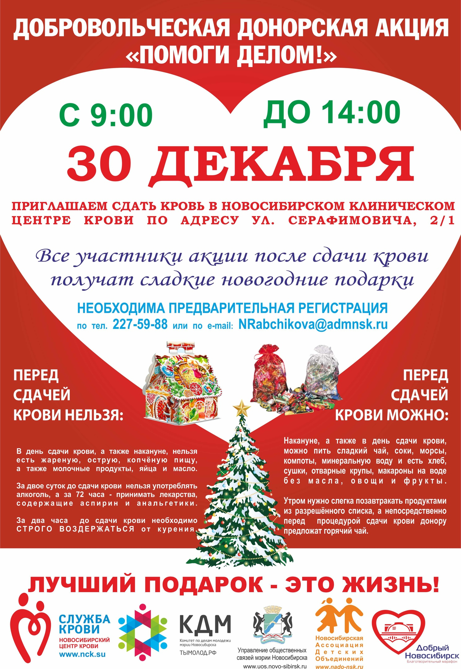 Напомним, донором может стать любой желающий в возрасте от 18 лет, имеющий прописку в Новосибирске или Новосибирской области, не перенёсший вирусных гепатитов и ВИЧ-инфекции, не имеющий гипертонической болезни. Чтобы принять участие в акции «Помоги делом!», нужно зарегистрироваться по телефону 227-59-88 или по электронной почте NRabchikova@admnsk.ru.