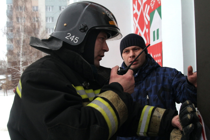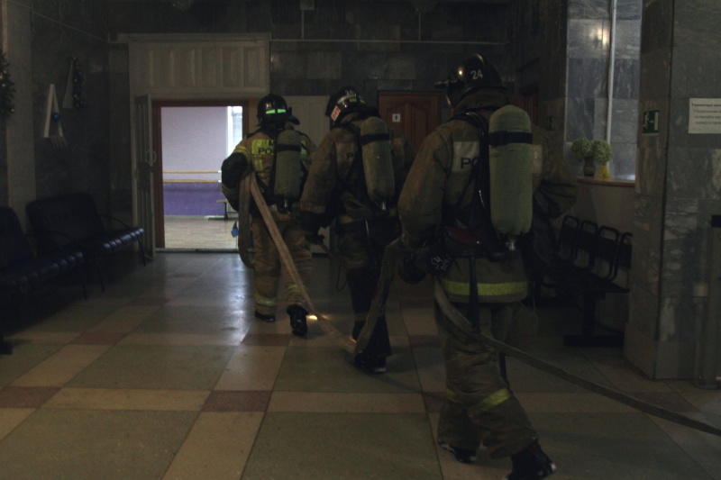 В Советском районе прошли штабные учения пожарных. Всё очень реалистично: сработка сигнализации, задымление помещений. Сценарий учений таков: пожар начался в районе сцены Дома культуры; как только сработали датчики дыма, из здания самостоятельно вышли 13 человек, а двое остались внутри. На их поиски отправились прибывшие на место пожарные.