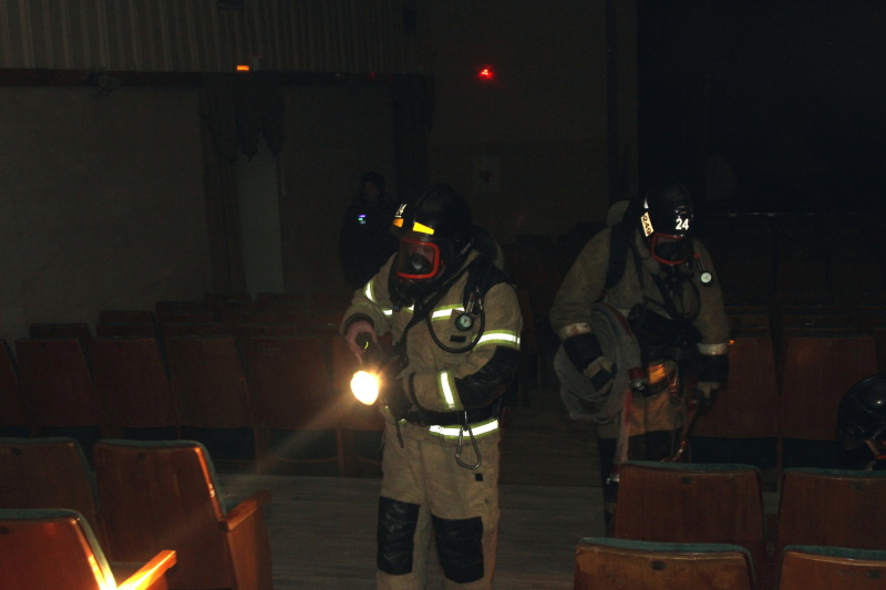 Прибывшие к месту условного возгорания пожарные первым делом приступили к поиску и эвакуации людей из помещения. Звену газодымозащитной службы в полной темноте и плотном дыму предстояло спасти двух пострадавших. Статисты были обнаружены в зрительном зале, где и располагался очаг пожара.
