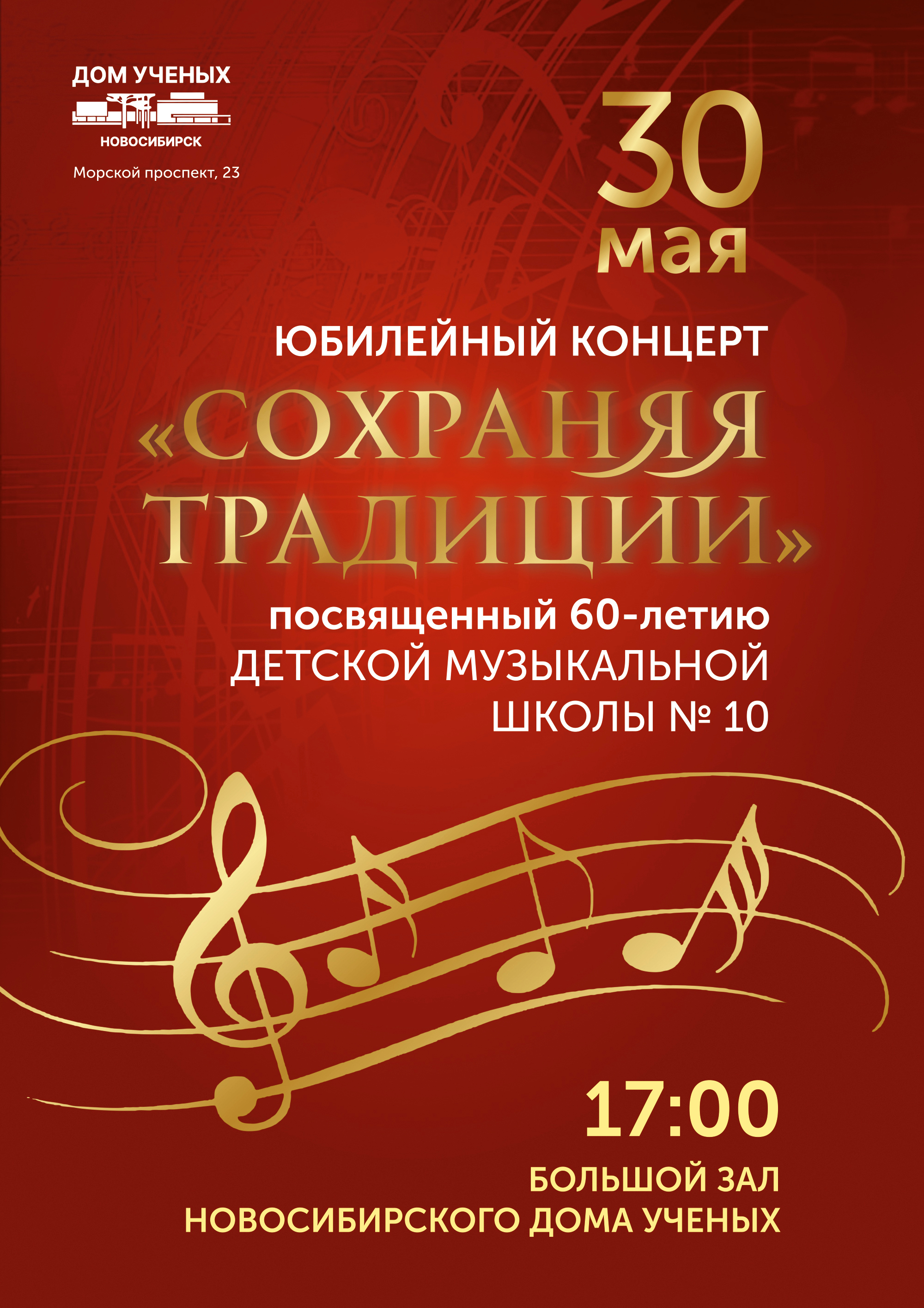 60-летие – солидный возраст, этап зрелости и достижения мудрости. В честь своего юбилея музыкальная школа №10 приглашает гостей и жителей Советского района на праздничный концерт «Сохраняя традиции». Кроме круглой даты в истории ДМШ, он посвящен 65-летию Советского района и 130-летию Новосибирска. Гостей ждут 30 мая в Большом зале Дома ученых в 17.00.
