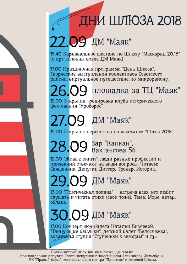Празднование начнется 22 сентября, в субботу, с карнавального шествия «Маскарад 20.18». Дружной колонной его участники пройдут от Дома молодежи «Маяк» по улицам микрорайона. Начало в 15.40. А в 17.00 начнется праздничная программа «День Шлюза».