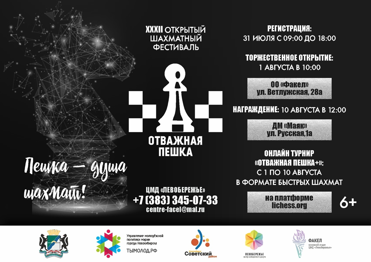 Онлайн-турнир «Отважная пешка+» пройдёт с 1 по 10 августа на платформе в формате быстрых шахмат. Для участия необходимо зарегистрироваться на сайте, подать заявку в клуб «Отважная пешка» на платформе lichess.org, а также заполнить заявку на участие в электронной форме.