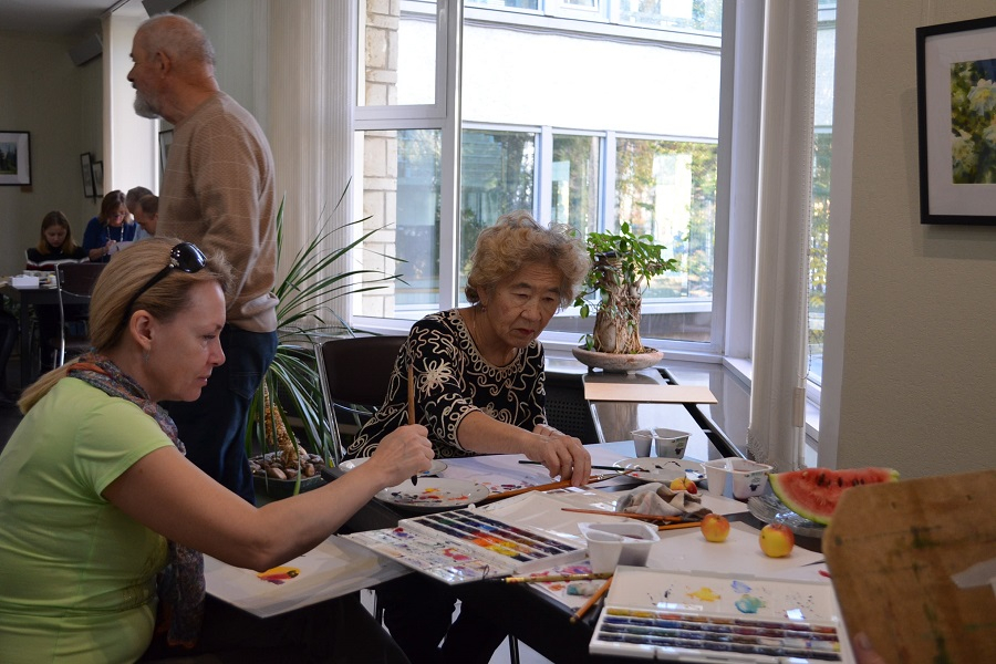 В выставочном зале люди делятся на две группы: тех, кто внимательно рассматривает выставку, и тех, кто учится рисовать самостоятельно. На столах с красками, кистями, листами бумагами – еще и «модели» в виде дольки арбуза и яблок. Рисуют все: взрослые и дети, женщины и мужчины.