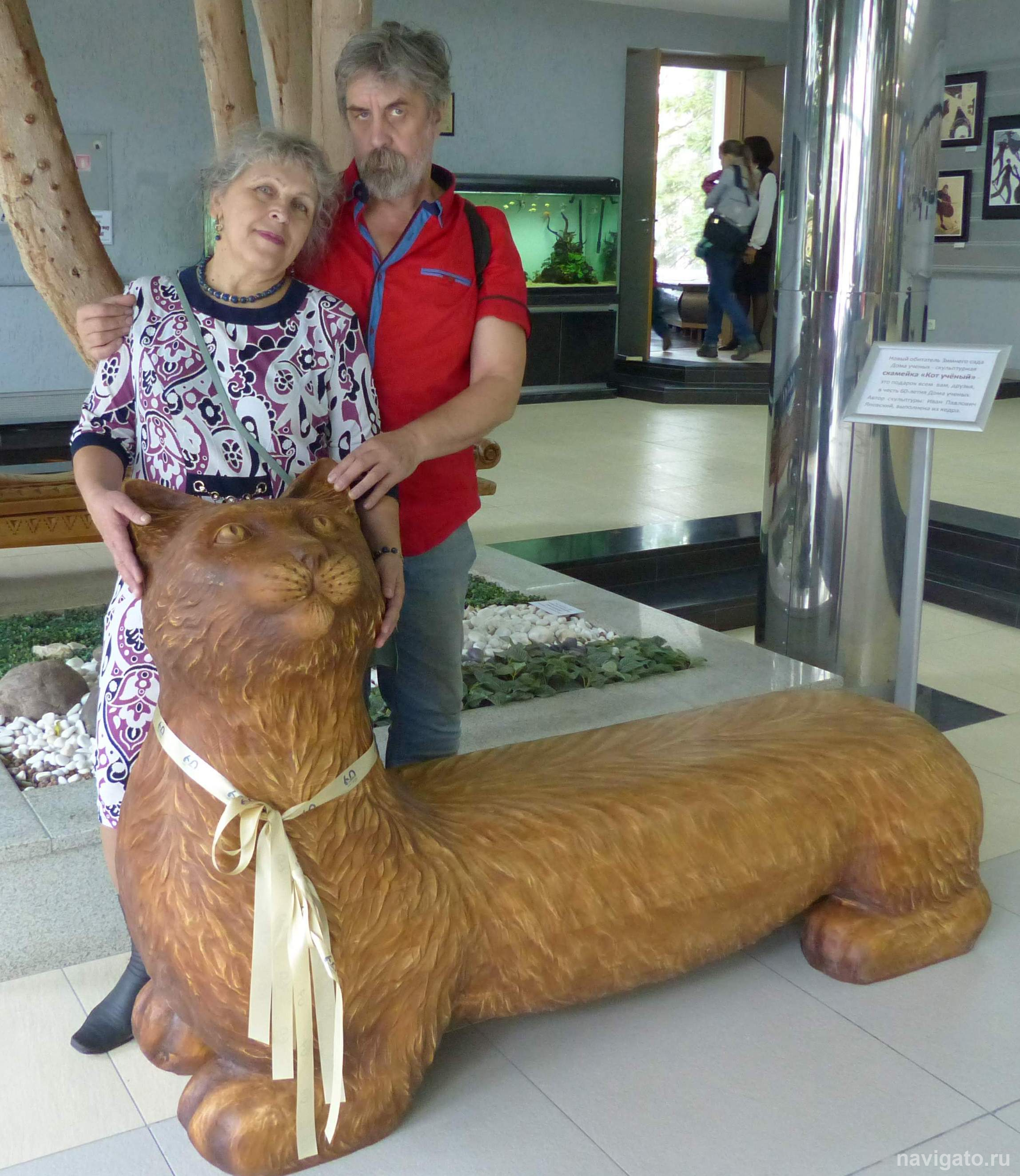 - Для всех желающих в течение дня проводили экскурсии по Дому учёных. Можно было побывать и за кулисами Большого зала, и в радиорубке, и в выставочных залах. В Зимнем саду все с интересом рассматривали деревянную скульптуру, подарок к 60-летию – лавочку из кедра «Кот учёный» (автор Иван Яновский). В библиотеке гости знакомились с раритетными экземплярами. Кстати, в книжном фонде ДУ более 30 тысяч изданий!
