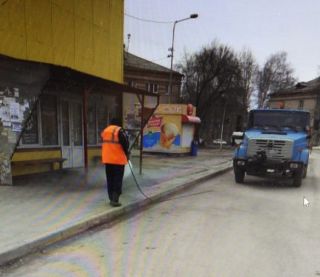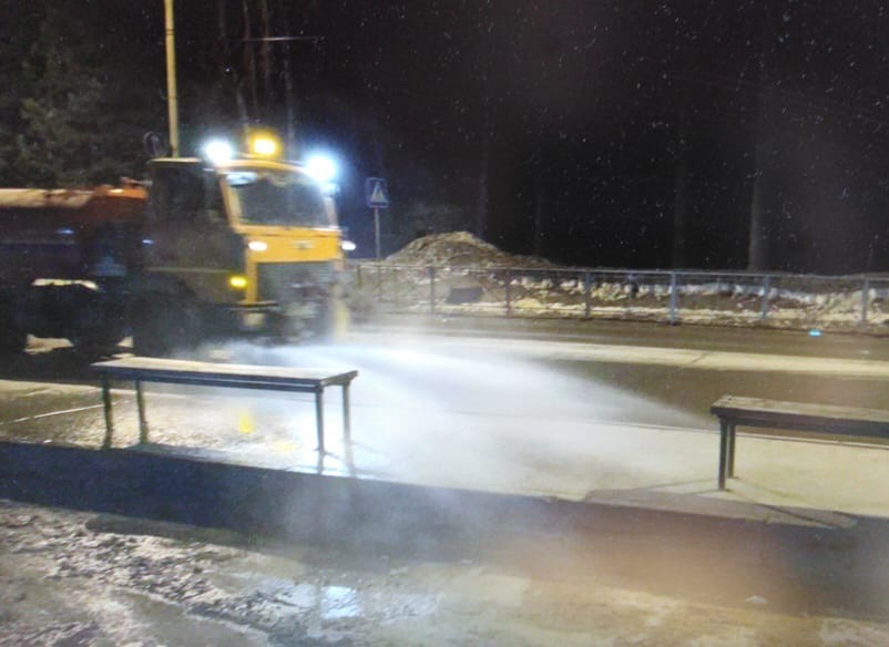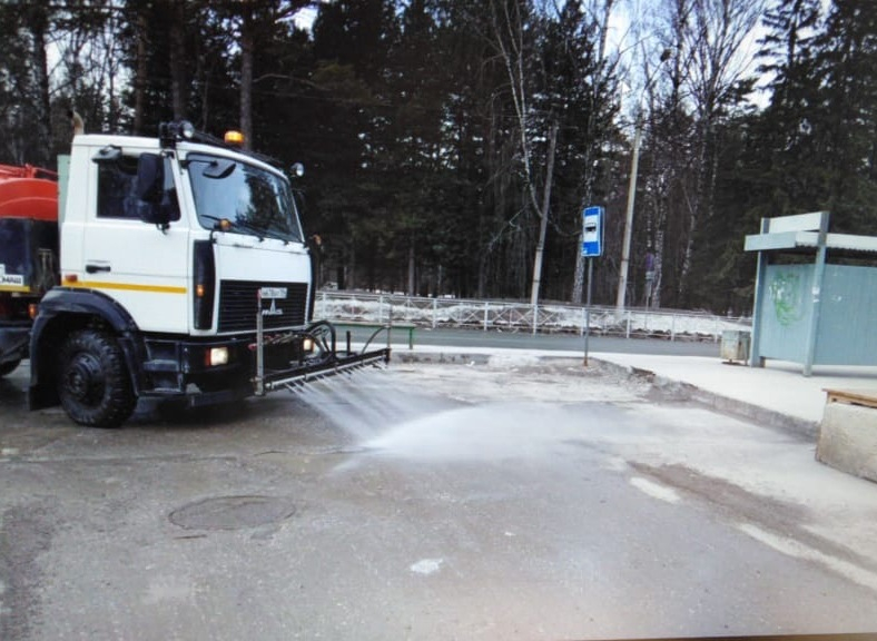 Раннее начало весенне-летних работ обусловила и ситуация с коронавирусом: хлорсодержащим раствором дезинфицируют площадки перед административными зданиями, детскими садами и школами, остановочные платформы и тротуары.