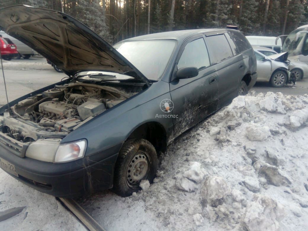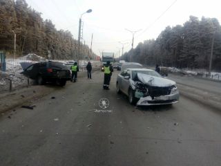В результате ДТП Toyota Camry получила серьезные повреждения передней части, а Toyota Caldina улетела в сугроб.