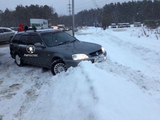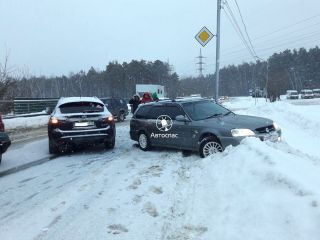 От удара одну из машин развернуло . Участники аварии перекрыли половину дороги. Движение осуществляется по одной полосе.