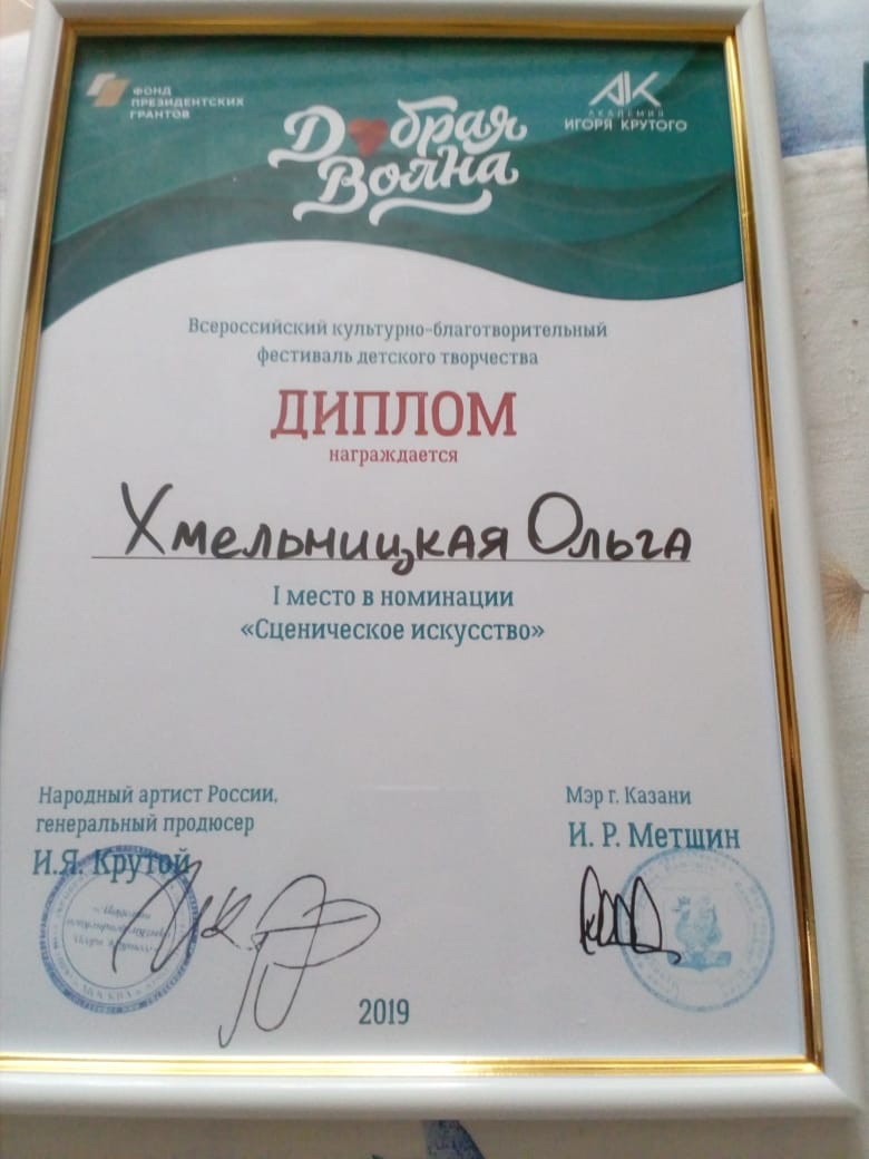 Тринадцатилетняя Оля Хмельницкая с первого класса выступает на сцене, участвовала и в школьных конкурсах чтецов, в районных и городских фестивалях творчества детей с ограниченными возможностями здоровья – «Творение души и рук моих!» и «Мы – талантливы!». Для всероссийского фестиваля Оля подготовила объёмное произведение Анастасии Загодиной.