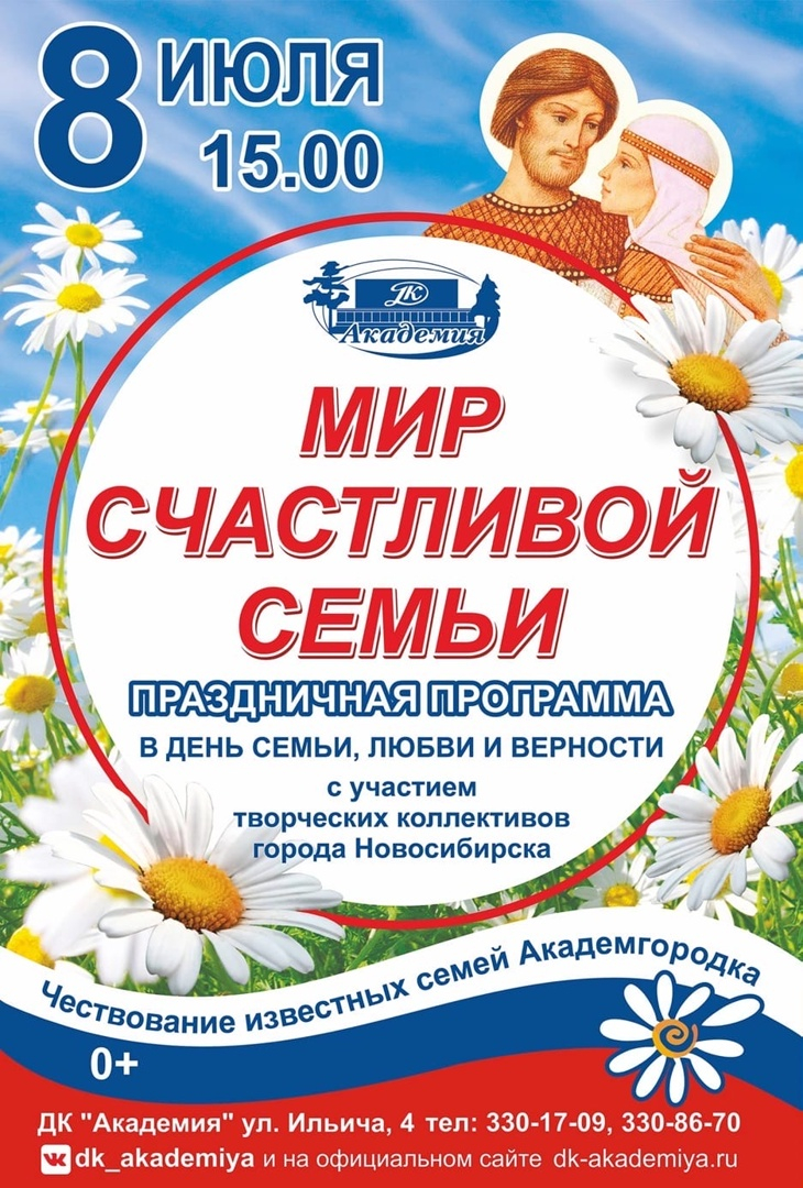 В Советском районе праздничная программа «Мир счастливой семьи» состоится 8 июля на площади ДК «Академия» (ул. Ильича, 4). Начало в 15 часов. Медалью «За любовь и верность» и грамотами будут награждены две супружеские пары: Геннадий Васильевич и Людмила Маркусовна Очеретные, а также семья Сергея Вячеславовича Лаврюшева и Светланы Васильевны Зубовой.