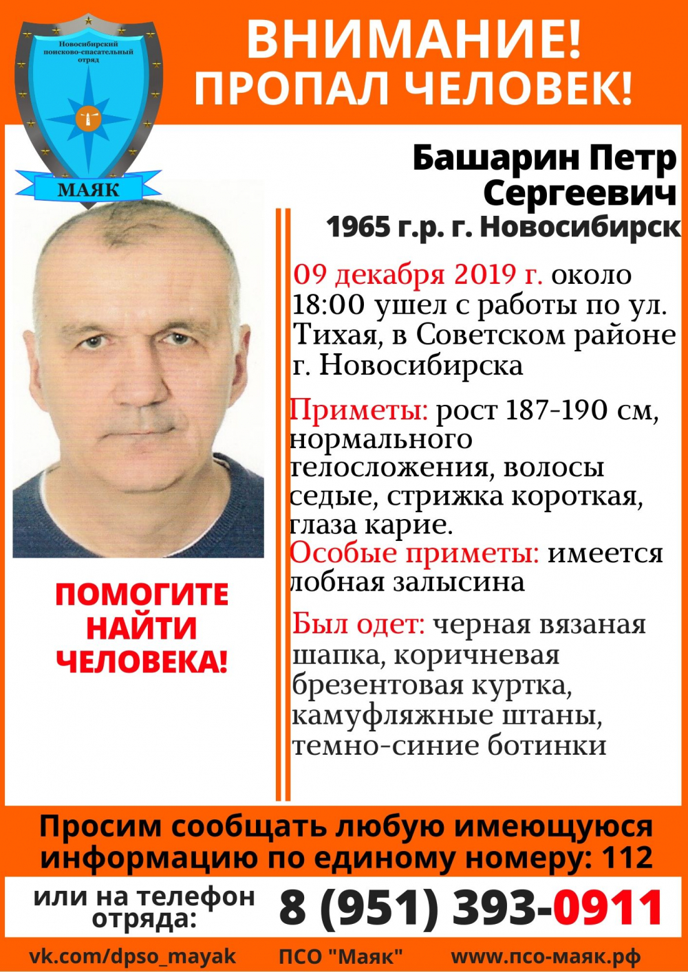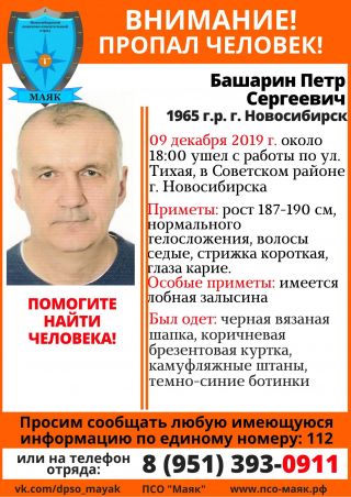 9 декабря в микрорайоне Шлюз пропал Петр Сергеевич Башарин. Мужчина вышел с работы и больше о нем ничего не известно.