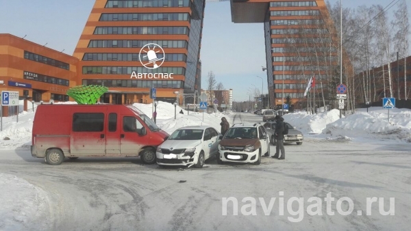 Skoda Octavia двигалась по ул. Николаева со стороны ул. Демакова в сторону пр. Академика Лаврентьева, Лада Калина - по ул. Инженерной со стороны ул. Академика Будкера в сторону ул. Кутателадзе. На перекресток Лада выехала под знак "Уступи дорогу" и столкнулась со Шкодой, которая двигалась по главной дороге. От удара Шкоду откинуло в микроавтобус Fiat.