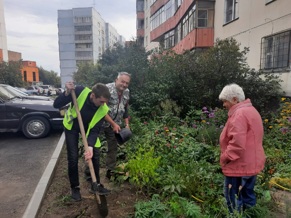 После награждения победителей волонтеры вместе с председателем ТСЖ «Варшавская» Виктором Веселовым и председателем совета ТОС «Пятый» Ириной Змитрович отправились во двор, чтобы посадить два кустика пузыреплодника, подаренных организаторами акции. Один из них определили возле дома по улице Варшавской, 15а, под окнами Валентины Федоровны Островской: её балкон по итогам конкурса в ТОС стал лучшим. А второй посадили на клумбе возле дома по Абаканской, 16а.
