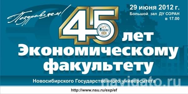 Оргкомитет приглашает всех желающих отметить 45-летие факультета. 29 июня, в пятницу, с 10 часов в фойе Большого зала Дома ученых СО РАН начнется регистрация участников. Экономический форум с участием академика Абела Аганбегяна и других известных экономистов начнется в 15 часов в Малом зале ДУ. Официально-торжественная часть состоится в 17 часов. В концертной программе выступят участники клуба Maximin разных лет, студенческие клубы НГУ, творческие коллективы. По окончании – фуршет.