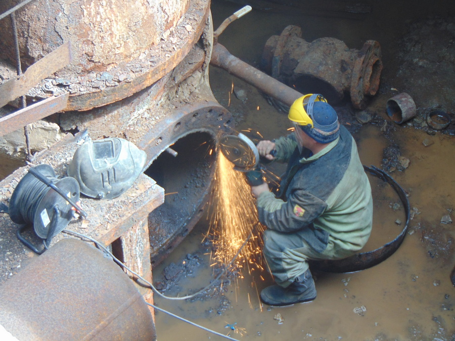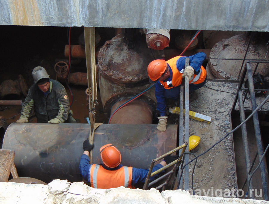 – Трудность в том, что здесь не прямолинейный участок, а врезки труб разных диаметров. От основной трубы 800 мм идет «шестисотка» в сторону «Юности» и «пятисотка» в сторону улицы Арбузова. Трубы надо вымерять, опускать вниз, подгонять на месте, потом поднимать на поверхность, где электрогазосварщик Игорь Туркин вырежет отверстия нужного диаметра точно по разметке. Приходится действовать таким образом, потому что в теплокамере из-за оборудования не развернуться. Только после тщательной подготовки и подгонки трубопровод будут монтировать.