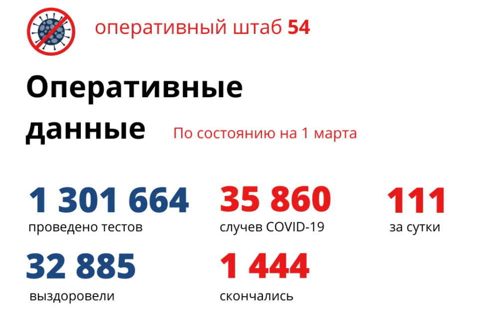 За последние сутки выявлено 111 случаев коронавируса, а всего за 11 месяцев в Новосибирской области зарегистрировано 35860 случаев коварной инфекции. Выздоровели 32885 пациентов, в том числе 61 за последние 24 часа.