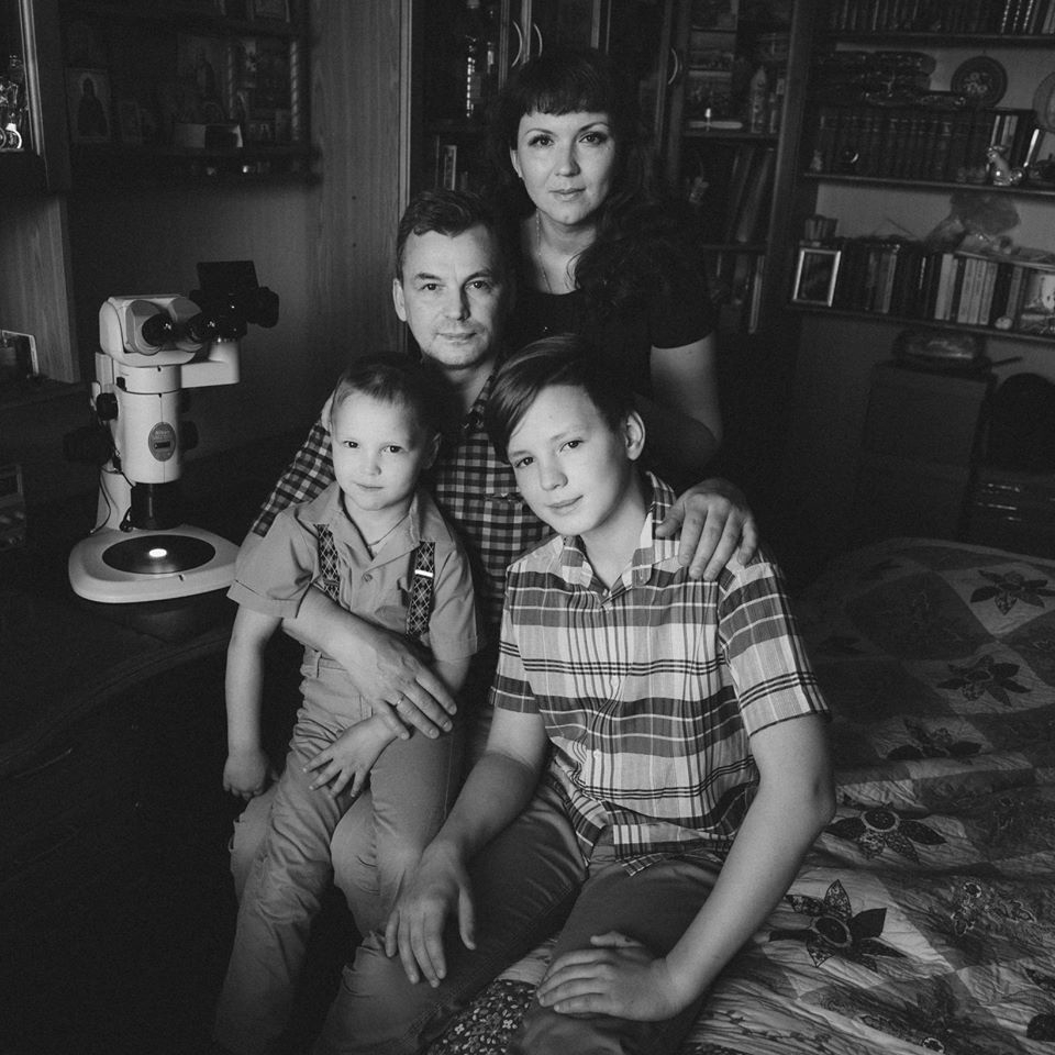– Анна сделала около двух десятков кадров. Профессионал работает быстро. Сначала выбрали мизансцену, чтобы в кадр вошли рабочий стол и микроскоп. А мы всей семьей расположились рядом – за исключением старшего сына Матвея, который учится в Москве. До этого Анна неоднократно нас снимала: мы знакомы лет 15, не меньше. Недавно моя жена пошла учиться в её фотошколу, в онлайн-режиме. Светик уже не пугается таких страшных слов, как «диафрагма», «выдержка» и ISO, быстро научилась видеть свет и ценить работу фотографа. Работаю у жены моделью. В общем, активно приручаем фотоаппарат под руководством Анна Масловой.