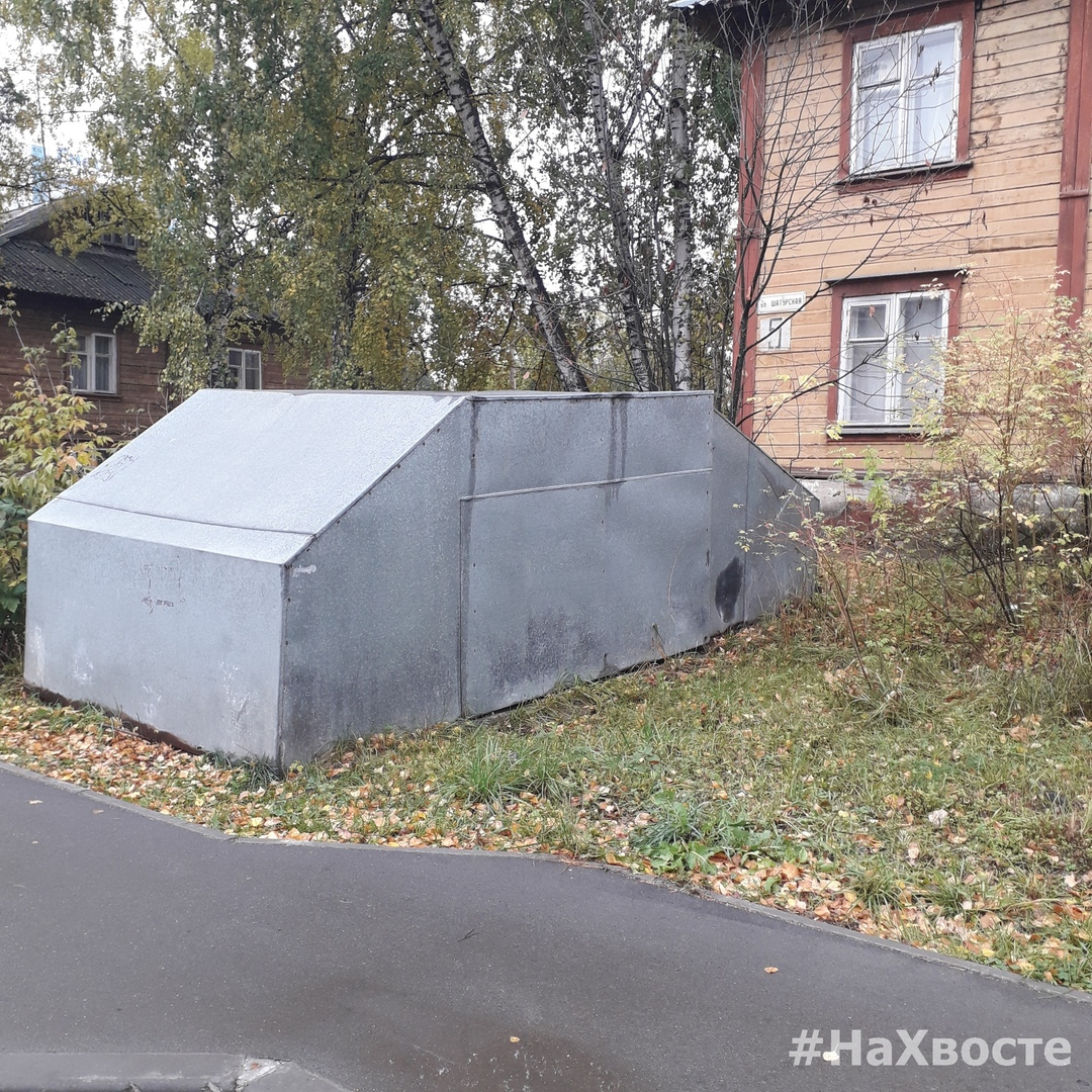 Возле деревянного барака на улице Шатурской в микрорайоне Щ предприимчивый автолюбитель сварил себе индивидуальный металлический гараж и установил его под окном на газон.
