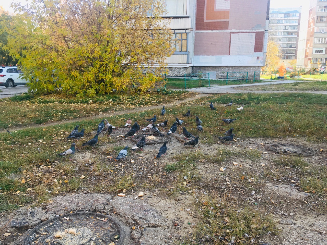 Недавно был конфликт и с родителями на детской площадке. Тут птичек решила покормить другая женщина. Итог: голуби облюбовали не только газон, но и детскую площадку, постоянно сюда собираются.