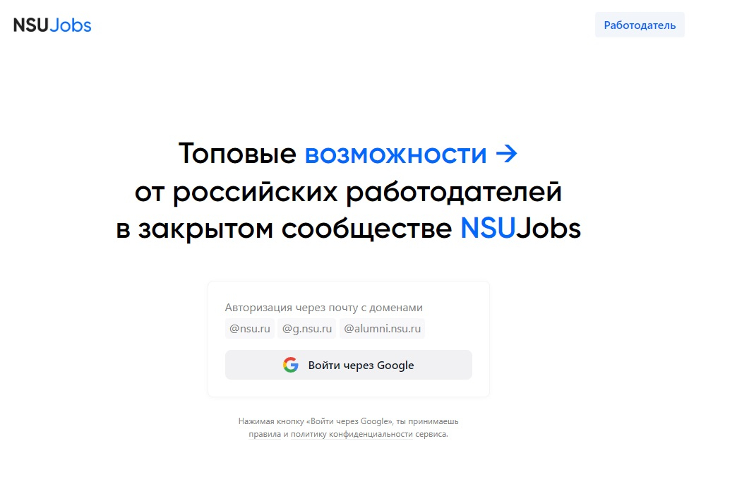 По сути наполнение сайта такое же, как у всех сайтов с вакансиями. Студенты НГУ проходят авторизацию с помощью электронной почты с доменом nsu.ru, заполняют анкету. Также на сайте можно смотреть предложенные компаниями вакансии.