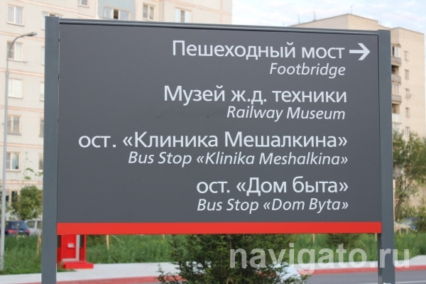 -  "Музей железнодорожной техники" переведен как Railway museum equipment, что означает "оборудование железнодорожного музея". Нормальный перевод — Railway Museum. Остановки "Клиника Мешалкина" и "Дом быта" переведены как Stop Clinic Meshalkina и Stop Dom byta, что означает "Остановите клинику "Мешалкина" и "Остановите Дом быта". Нормальные варианты перевода — Bus Stop "Klinika Meshalkina" и Bus Stop "Dom Byta",