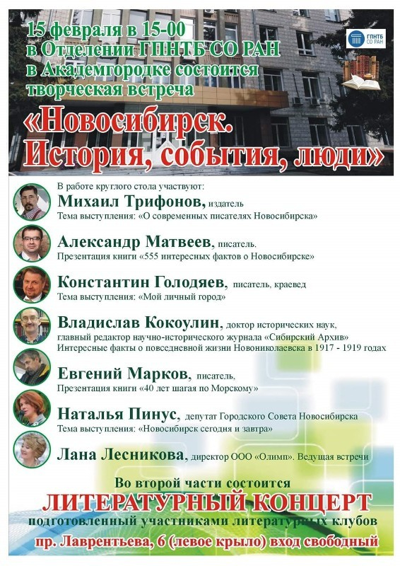Историки, писатели и депутат в Отделении ГПНТБ расскажут о Новосибирске