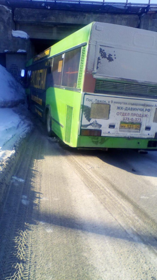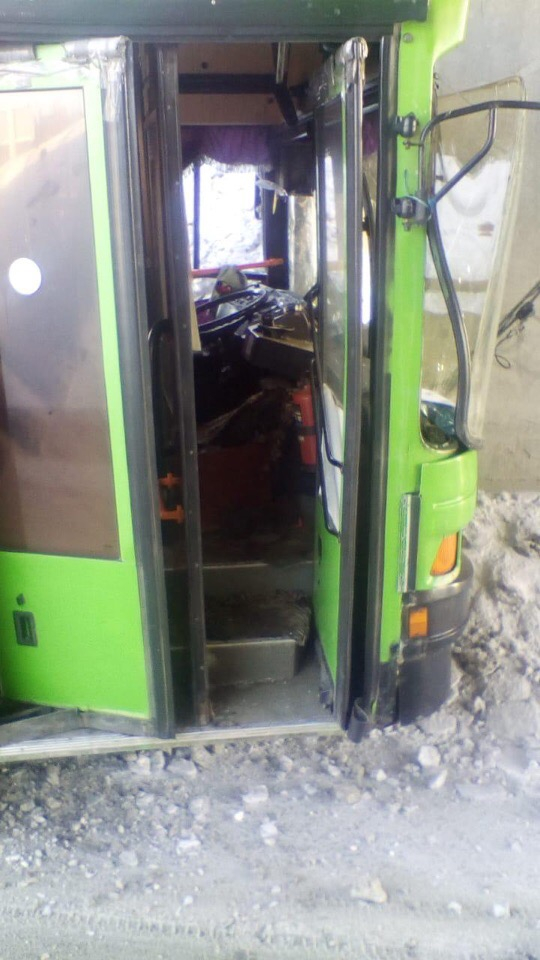 Водитель муниципального автобуса, выезжая из Нижней Ельцовки, не справился с маневром и врезался в бетонную стену.