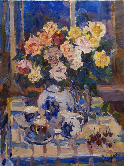 В экспозиции юбилейной выставки – великолепные портреты художников, поэтов, пейзажные этюды и композиции, групповые сцены (балерины, музыканты), экзотические павлины в райских садах и потрясающие цветы – розы, ирисы, лилии.