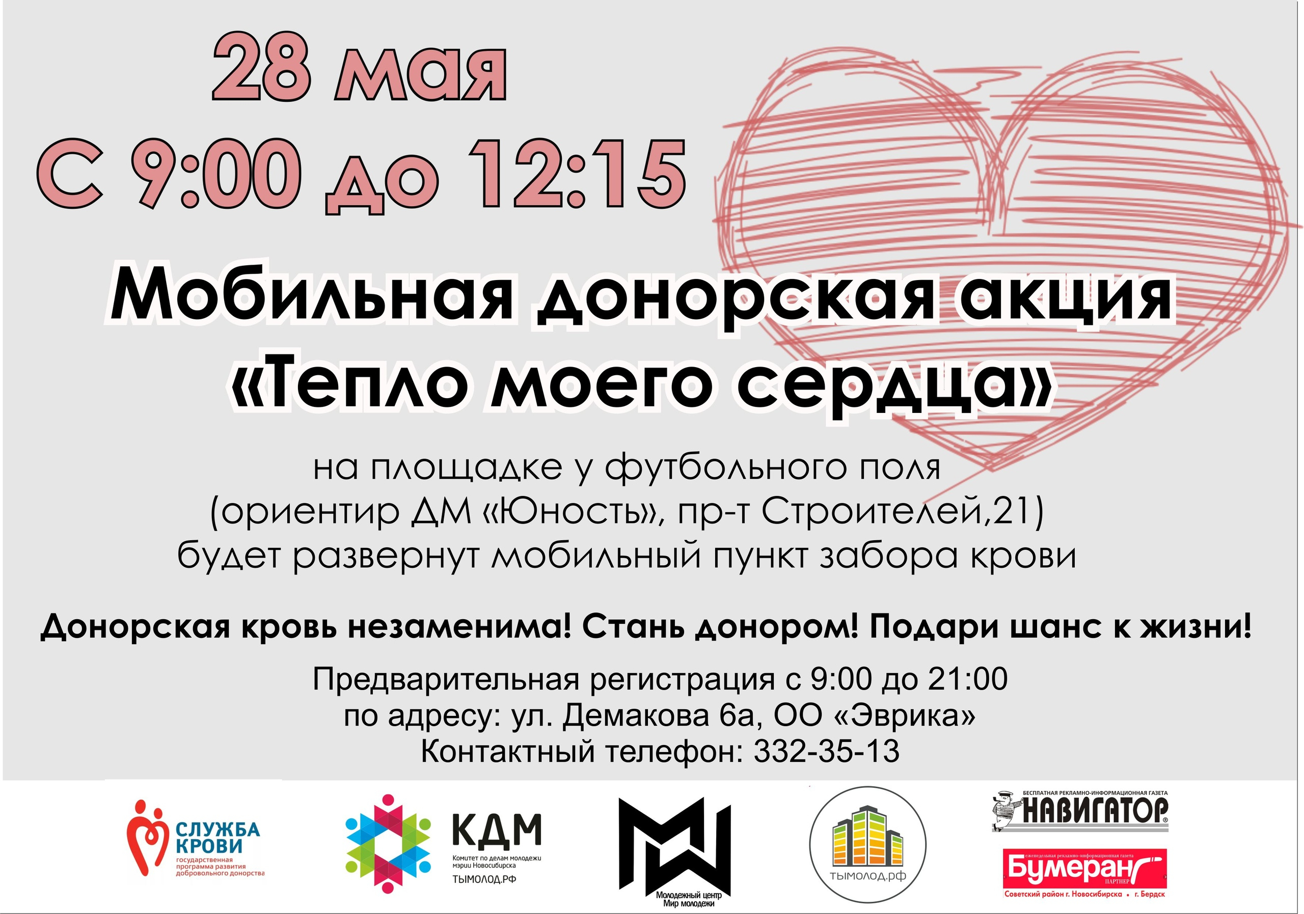 – 28 мая с 09.30 до 12.15 на асфальтированной площадке перед торцевой частью футбольного поля у Дома молодежи «Юность» (проспект Строителей, 21) будет развернут мобильный пункт забора крови, где любой желающий сможет стать донором, – рассказывают организаторы акции.