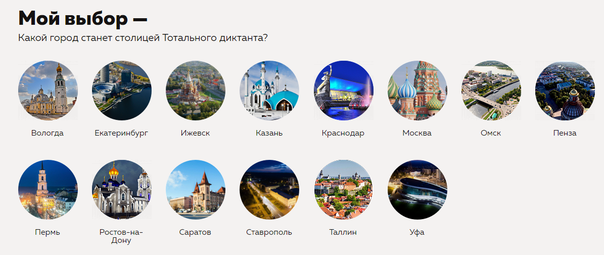 В этом году в конкурсе за право стать столицей Тотального диктанта будут бороться 14 городов: Пенза, Ростов-на-Дону, Саратов, Омск, Казань, Ставрополь, Пермь, Екатеринбург, Москва, Краснодар, Ижевск, Вологда, Уфа и Таллин.