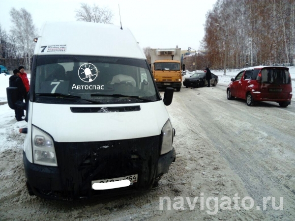 Авария произошла напротив АЗС Газпромнефть (ул. Кутателадзе, 5). Участники ДТП двигались навстречу друг другу по ул. Кутателадзе: Toyota Camry - со стороны пр. Академика Лаврентьева, маршрутка №7 - во встречном направлении.