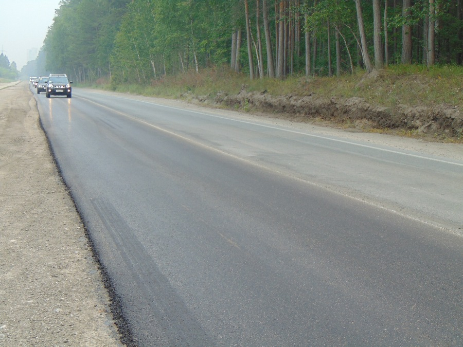 Дождя не было, а смог от лесных пожаров не помешал сегодня ночью уложить асфальт, на этот раз с применением специализированной техники. Участок получился ровный и красивый. Когда покрытие немного запылится, о том, что здесь была глубокая колея, будет напоминать только стык.