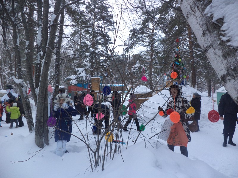 В этот же день в парке культуры и отдыха «У моря Обского» еще и открывали новогоднюю ёлку. Наряженное деревце стоит на высокой снежной насыпи между двумя деревянными горками, залитыми водой.