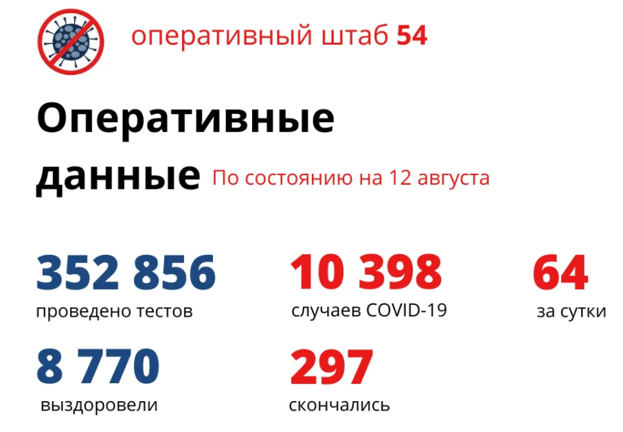 Региональный оперативный штаб опубликовал данные по ситуации с COVID-19 на утро 12 августа. За сутки выздоровели 146 человек, заболели 64. К сожалению, тяжелая болезнь оборвала жизни пятерых сибиряков.