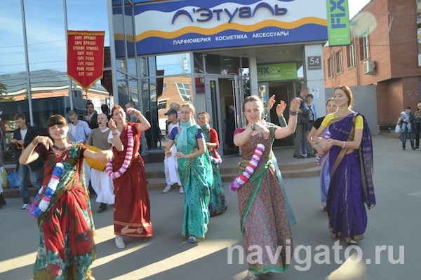 Около старого универмага кришнаиты стояли около получаса, после чего отправились дальше — по тротуару в сторону городского Дома культуры. По словам Валерия, их акция согласована с властями: за 10 дней они подали уведомление и согласовали маршрут.