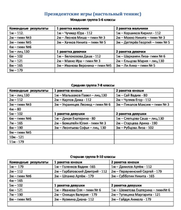 Лучшие результаты в командном зачете показали юные теннисисты из школы №112, лицея №130 им. М. А. Лаврентьева и школы №179.