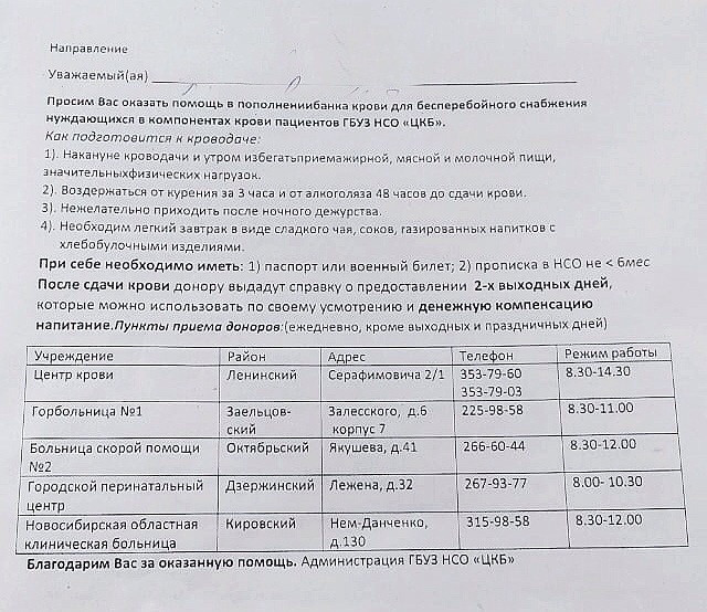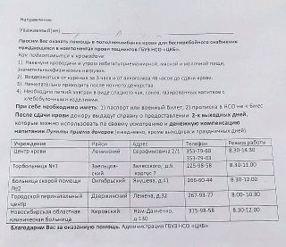 Нужна кровь любой группы, но желательно 3-я отрицательная. Адреса пунктов сдачи указаны на фото.