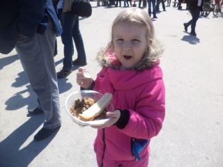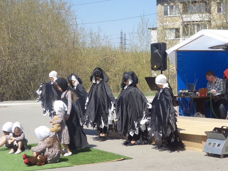 Более трёх часов ликовал Победный Май около торгового центра «Маяк» на Шлюзе. В обширную программу вошли танцевальные постановки, фрагменты радиосообщений, а также стихи и песни о войне. Не забыли организаторы и об угощении. Проголодавшиеся гости могли подкрепиться солдатской кашей и горячим чаем. Рядом стояли торговые палатки с шашлыком и выпечкой. Лавочек на всех не хватило, и некоторые устроились на металлических трубах временного ограждения.