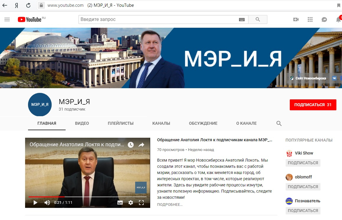 С самого начала работы на посту мэра я уделяю большое внимание общению с горожанами. Для того, чтобы ближе познакомить новосибирцев с мэрией, показать рабочие процессы изнутри, поделиться информацией о том, какую поддержку можно получить от администрации города в простой и понятной форме, мы создали канал МЭР_И_Я на YouTube, – написал на своей страничке в соцсети мэр Новосибирска Анатолий Локоть.