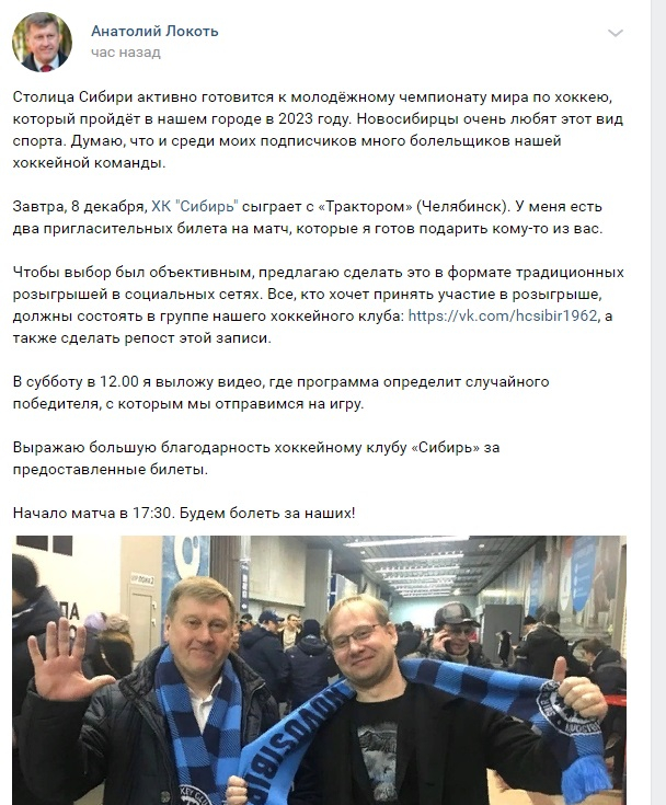 Мэр Новосибирска Анатолий Локоть решил провести на своей личной страничке ВКонтакте розыгрыш пригласительных билетов на матч ХК «Сибирь» против ХК «Трактор».