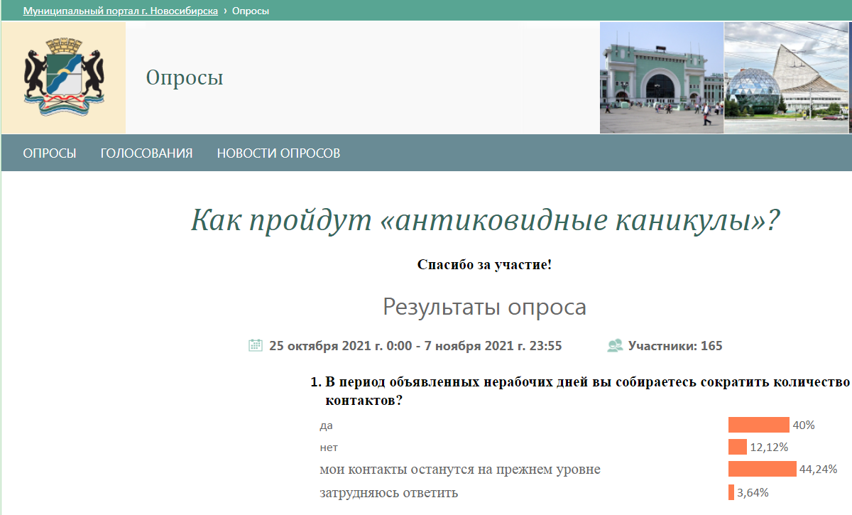 На муниципальном портале Новосибирска стартовал опрос об «антиковидных каникулах», которые продлятся с 30 октября по 7 ноября. Горожанам предлагают ответить на 8 вопросов.